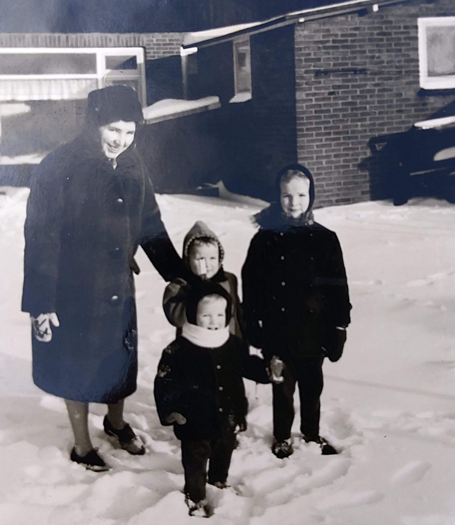 “Vroeger stond de wijk hierachter er helemaal niet. We keken uit over het land, zo naar het Schoonebeeker Diep. De manier waarop het water werd beheerd, was toen anders. Het kon wel gebeuren dat het water van de rivier tot in onze tuin kwam.” Arjan wijst naar de rand van de grote tuin. Zo veel buiten, daar was het natuurlijk fijn spelen. Ook de bouw van de nieuwe wijk was een groot speelavontuur. Hij maakte het allemaal mee. Als we door de tuin lopen, herinnert hij zich hoe hoog de sneeuw er soms was. Daar heeft hij nog een foto van, samen met zijn moeder en broertjes in de sneeuw.