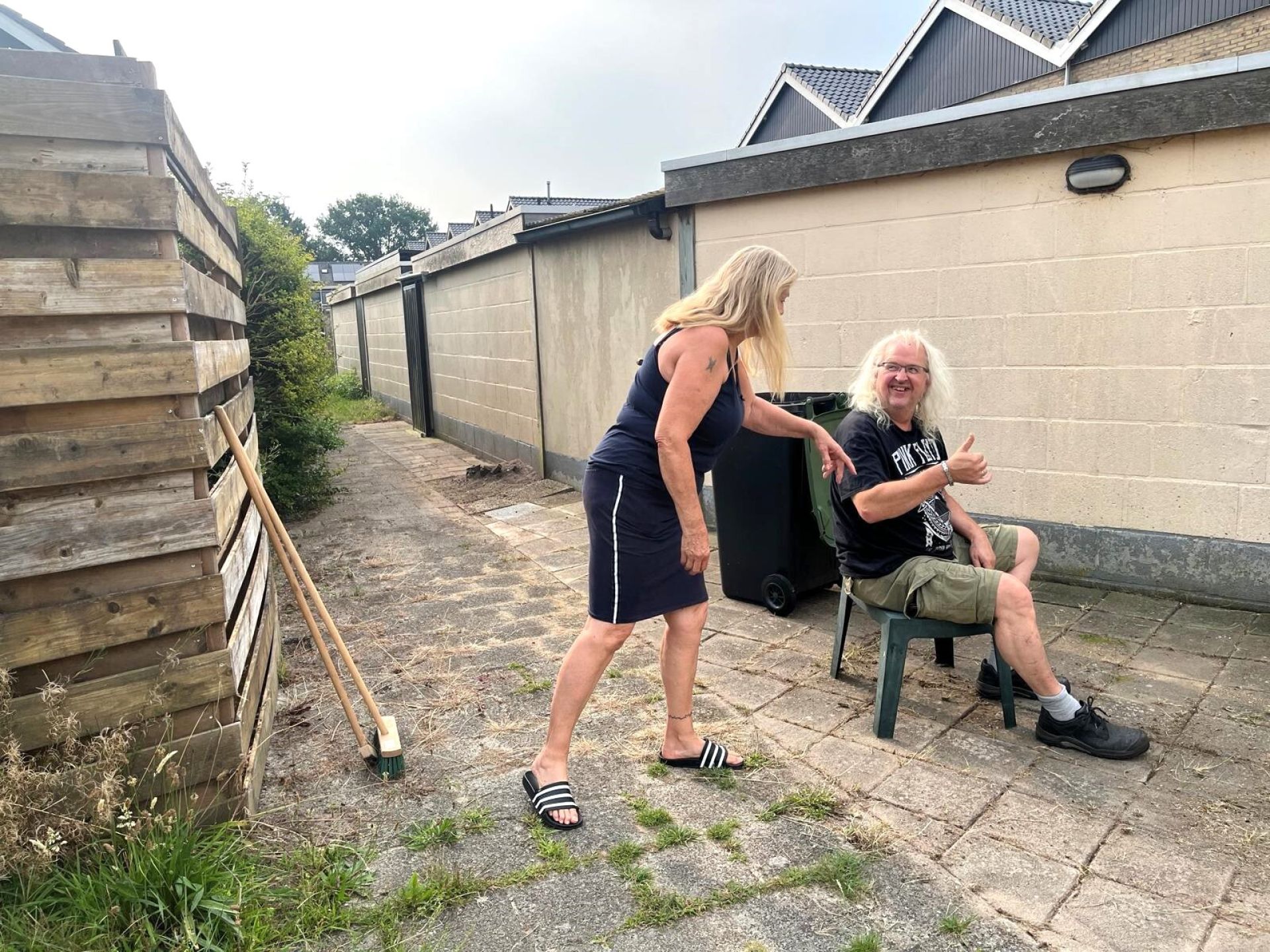 Gertjan van Grootgroener legt uit dat je met een onkruidbrander niet over de paden tussen de huizen door kunt. Dus komen de bosmaaiers en onkruidschrobbers goed van pas. Intussen vertelt buurvrouw Evelien dat ze eigenlijk nooit achter het huis komt. Maar dat het netjes is, vindt ze wel belangrijk. Dus daarom helpt ze mee. Het is mooi om te zien hoe gemoedelijk het eraan toegaat op het achterpad. De 1 helpt de ander, mensen maken een praatje en er wordt gelachen. Dat niet iedereen er is, tja, dat is nu eenmaal zo. De buren werken er niet minder hard om. En na een rondje langs de voordeuren zijn er steeds meer mensen bezig.