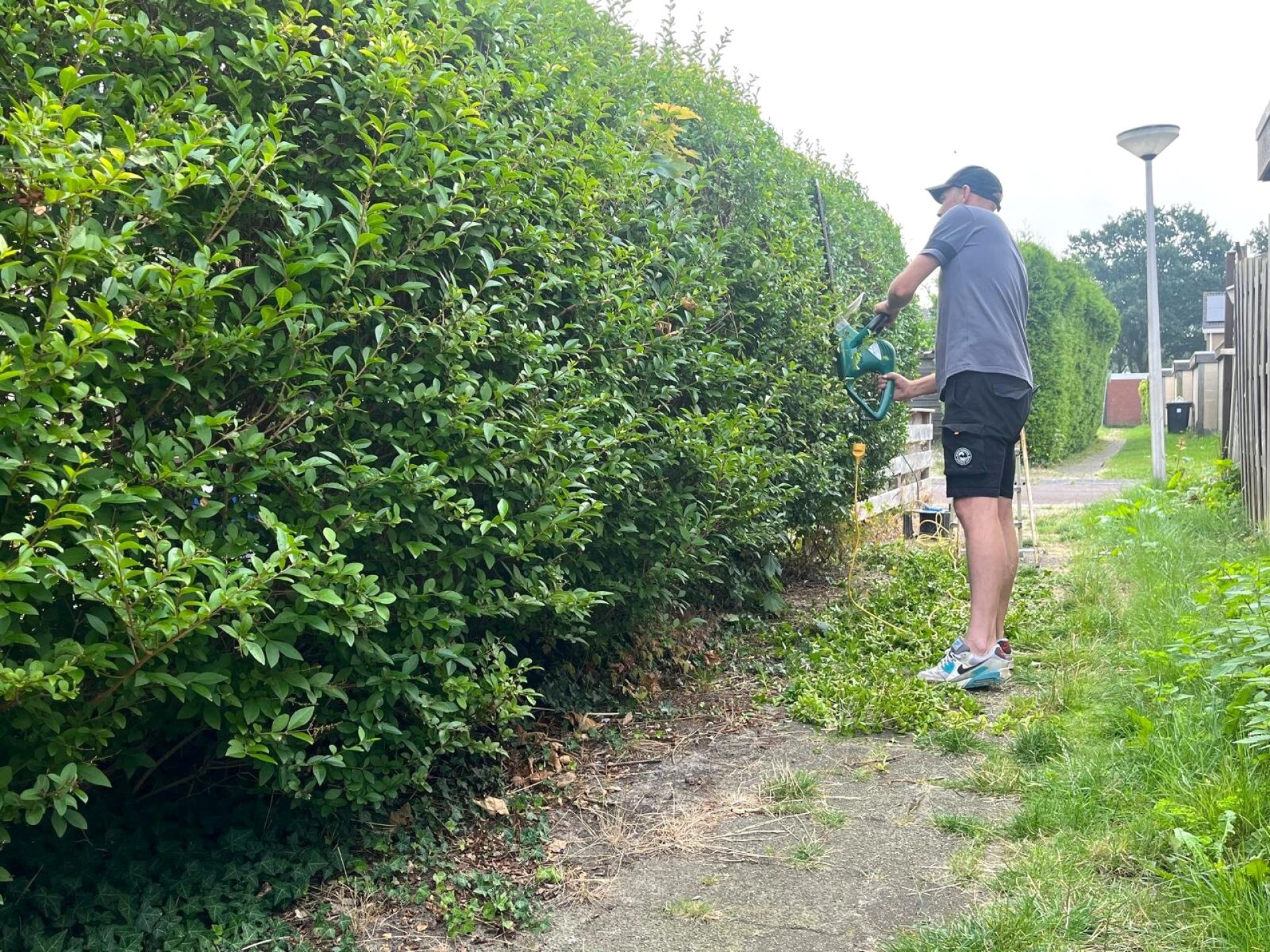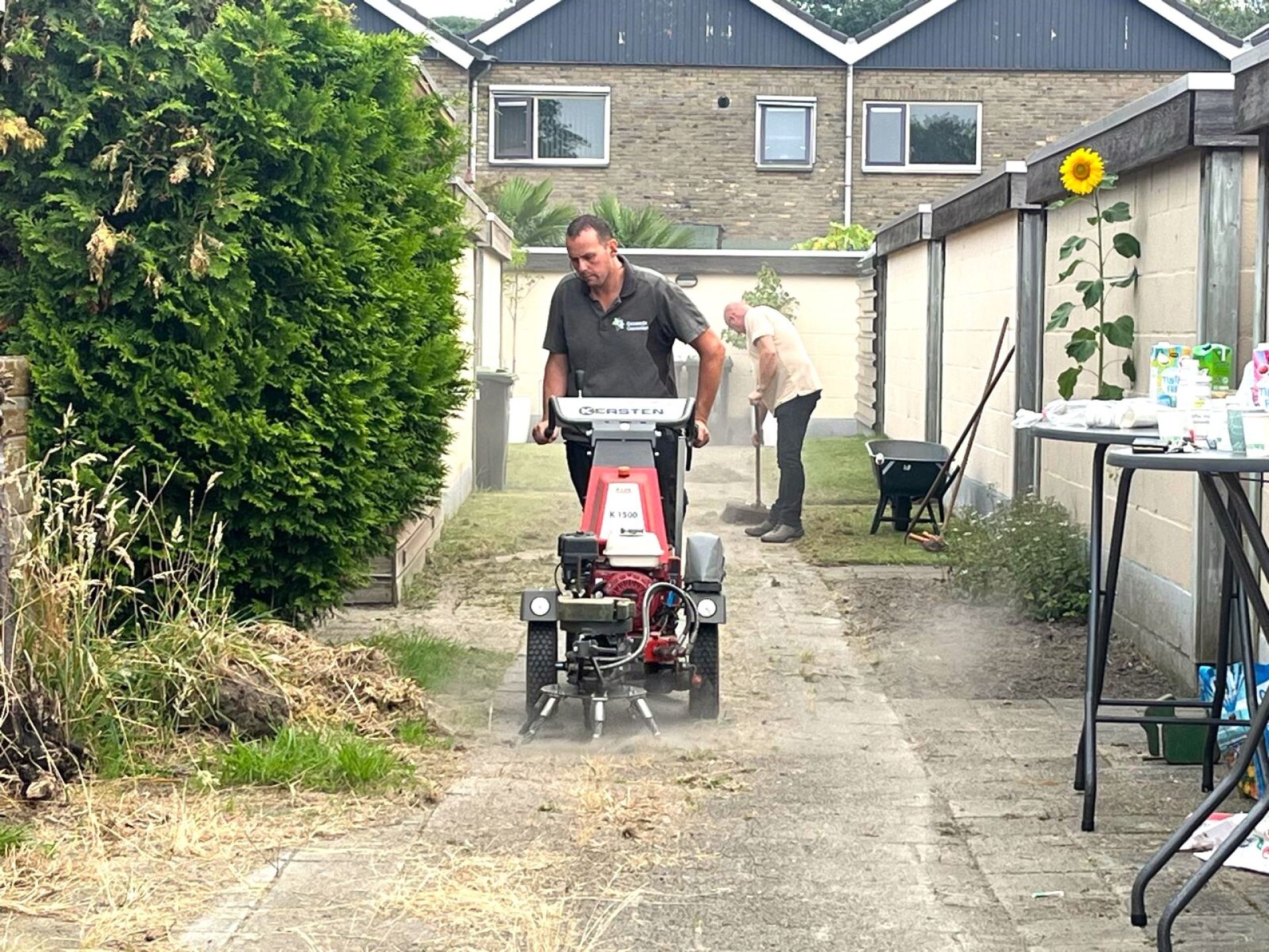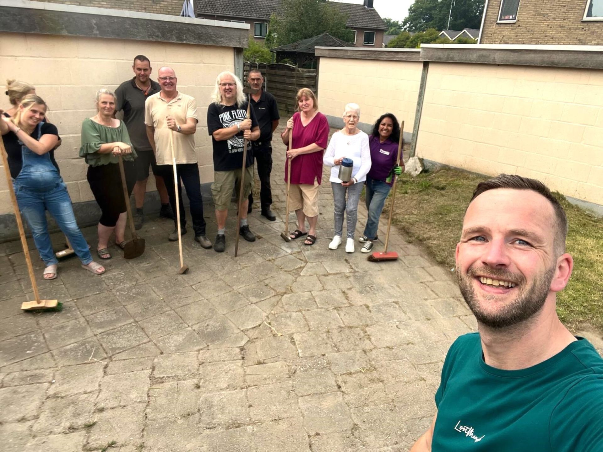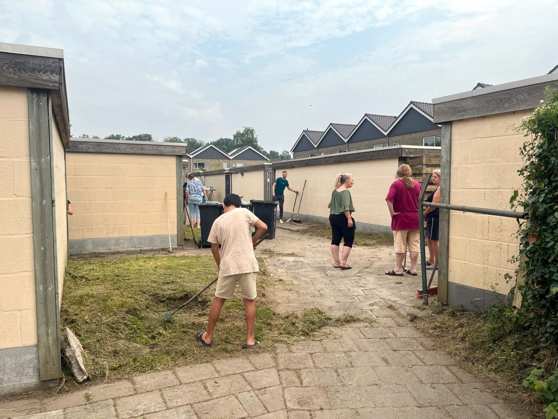 Zo werd de achterpad-opruim-actie bedacht. Begin augustus kwamen huurders, gemeentewerkers, mensen van Grootgroener, Stefan van MWC (Maatschappelijk Welzijn Coevorden) en Saphira bij elkaar op het achterpad. Met tuingereedschap, bosmaaiers en onkruidvegers ging iedereen vol goede moed aan het werk. “Het weer zit mee”, zegt 1 van hen: “Het is nog niet te warm en de zon blijft nog even weg.” Zo kan er lekker worden doorgewerkt. De 1 zit op een krukje en schraapt het onkruid tussen de tegels weg. De ander snoeit flink met de heggenschaar. En mevrouw Hilbrink zorgt voor de koffie. Want als je samen de schouders eronder zet, is het ook fijn om samen een bakkie te drinken.