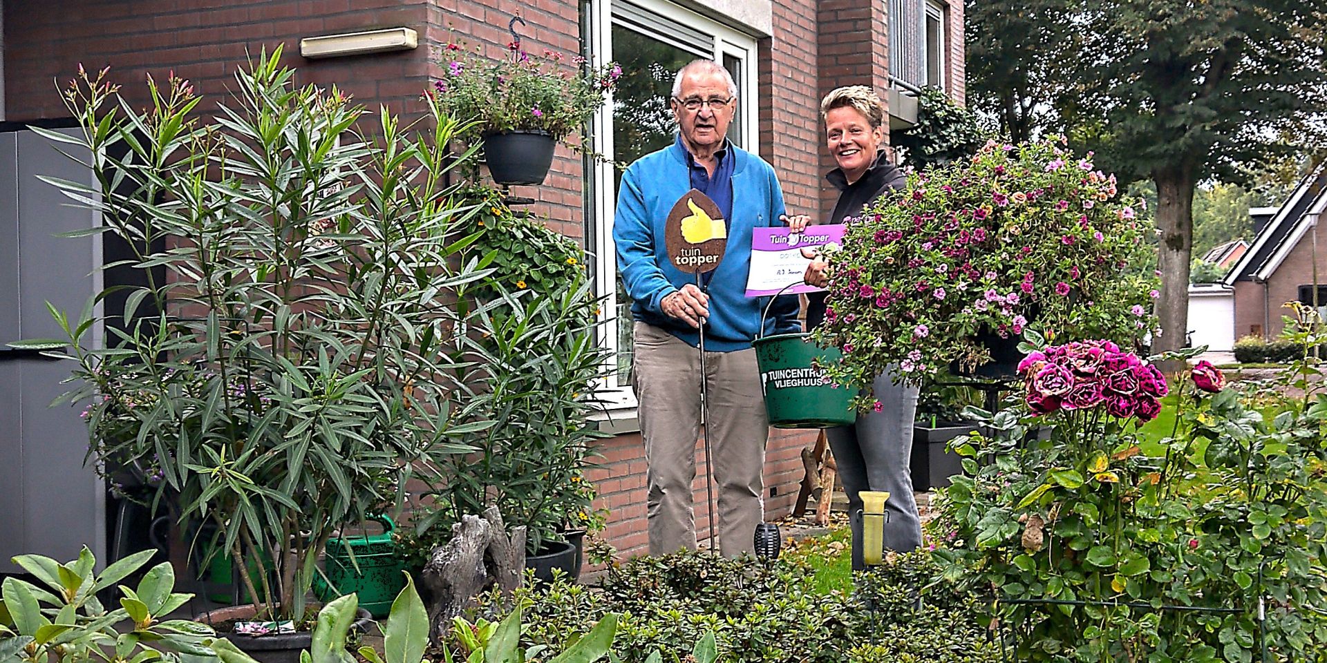 Bertus Jansen staat ons al op te wachten op het terras van zijn huis aan de Maandehof. “Als je een maand geleden was gekomen, had je alles nog vol in bloei gezien”, vertelt hij. Maar hij heeft een vrolijke verrassing: welke planten hebben daar nieuwe knoppen?