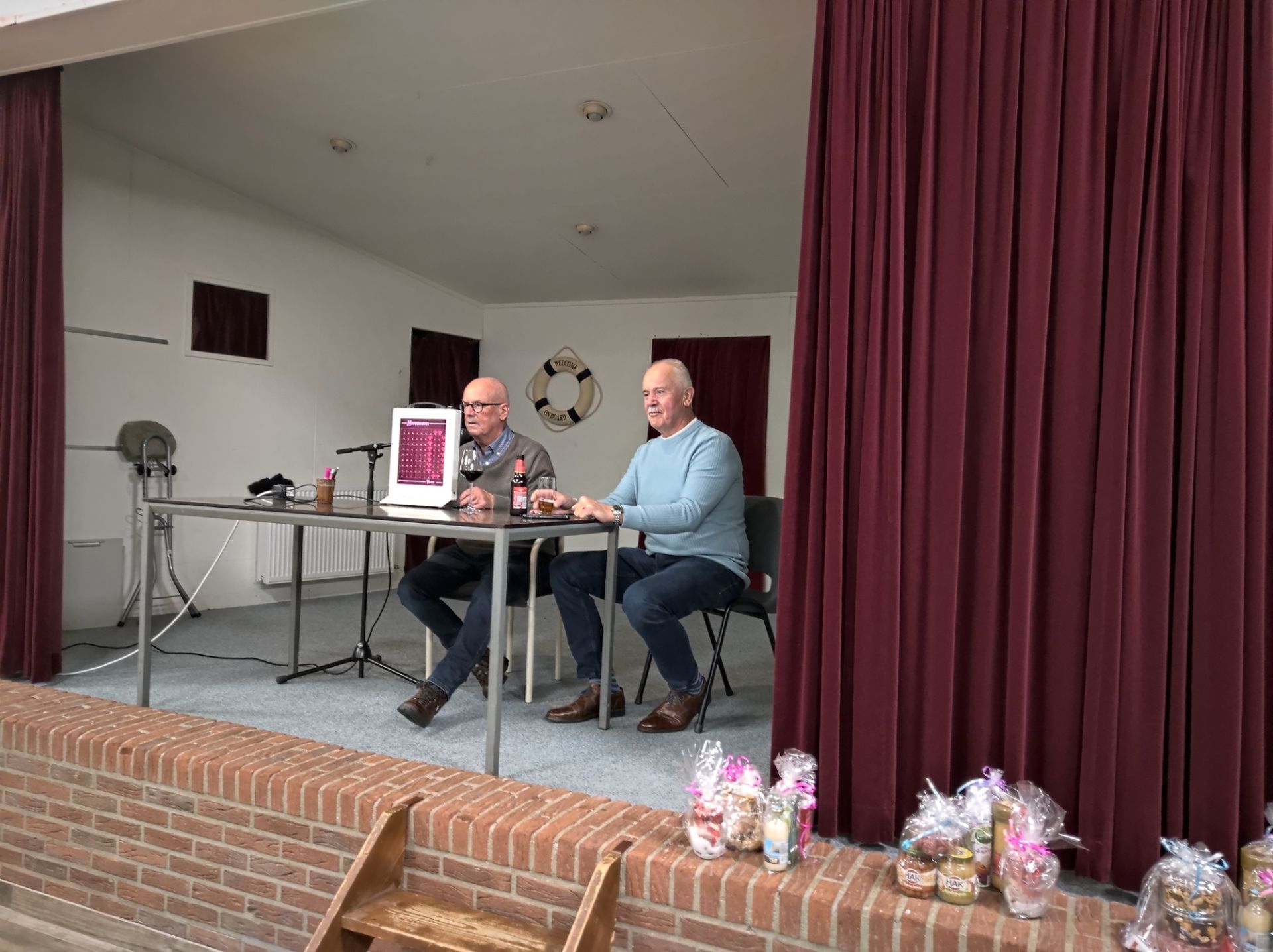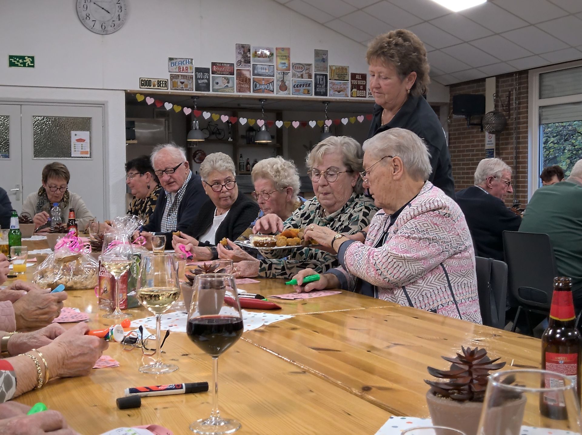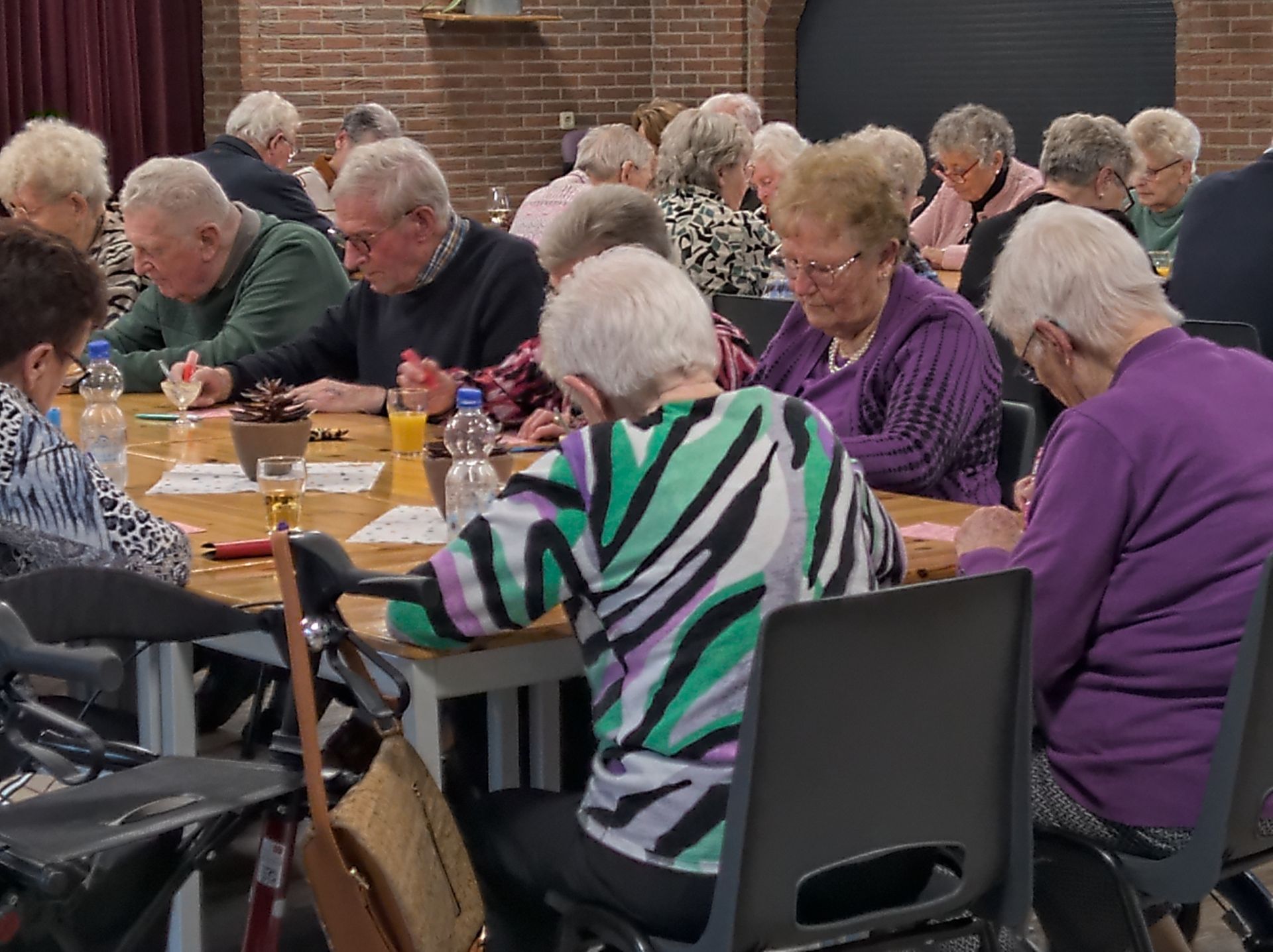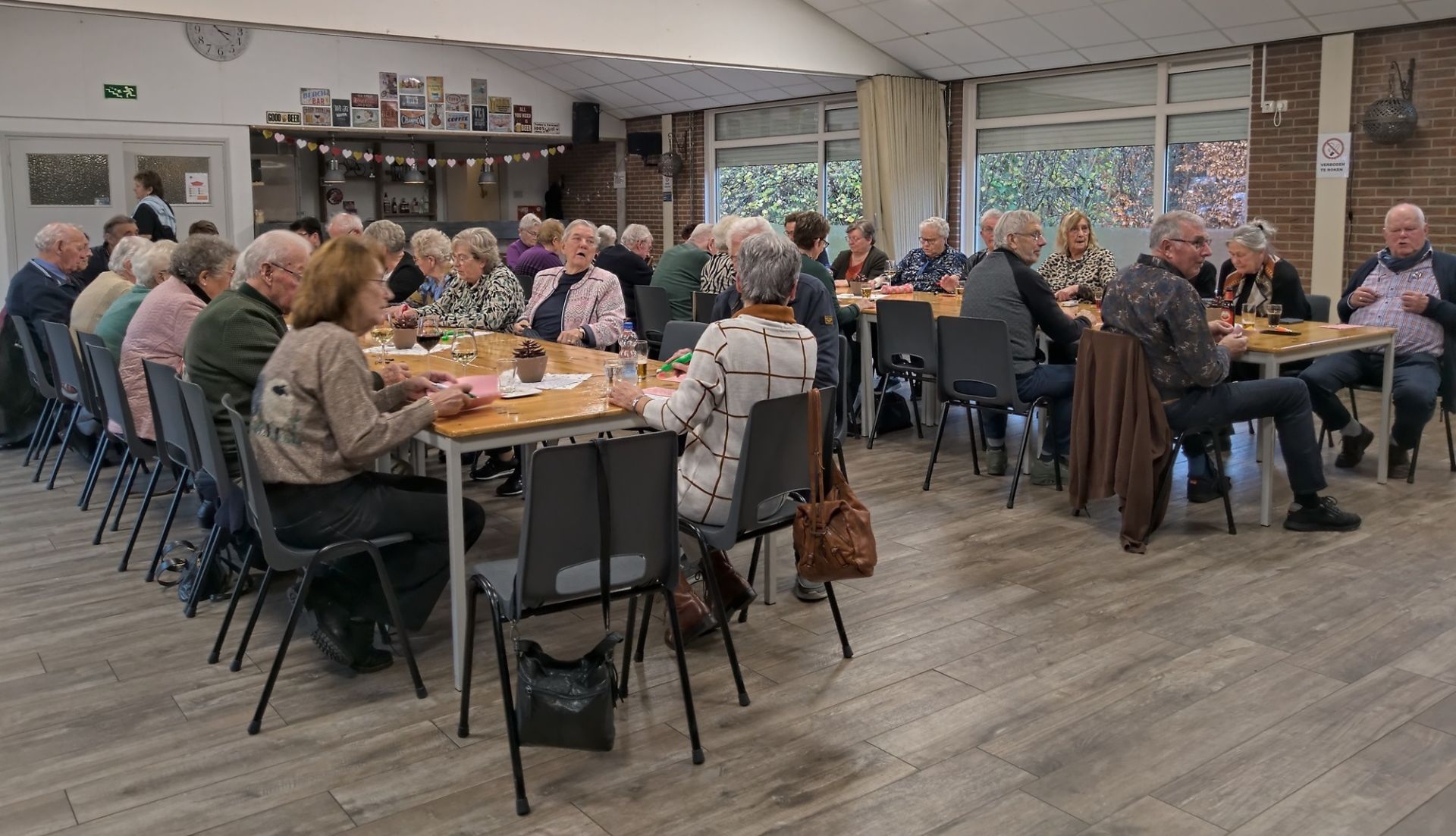 Nog even een lekker hapje en dan wordt het tijd voor de bingo. Joop assisteert Piet, die de nummers gaat trekken. “Met die twee wordt het wel een feestje.” Als de bingokaarten zijn uitgedeeld, zegt er eventjes helemaal niemand iets. Tot er vanaf andere kant van de tafel wordt geroepen: “Hoe krie’j ze stille!’ Aan humor geen gebrek vanmiddag.