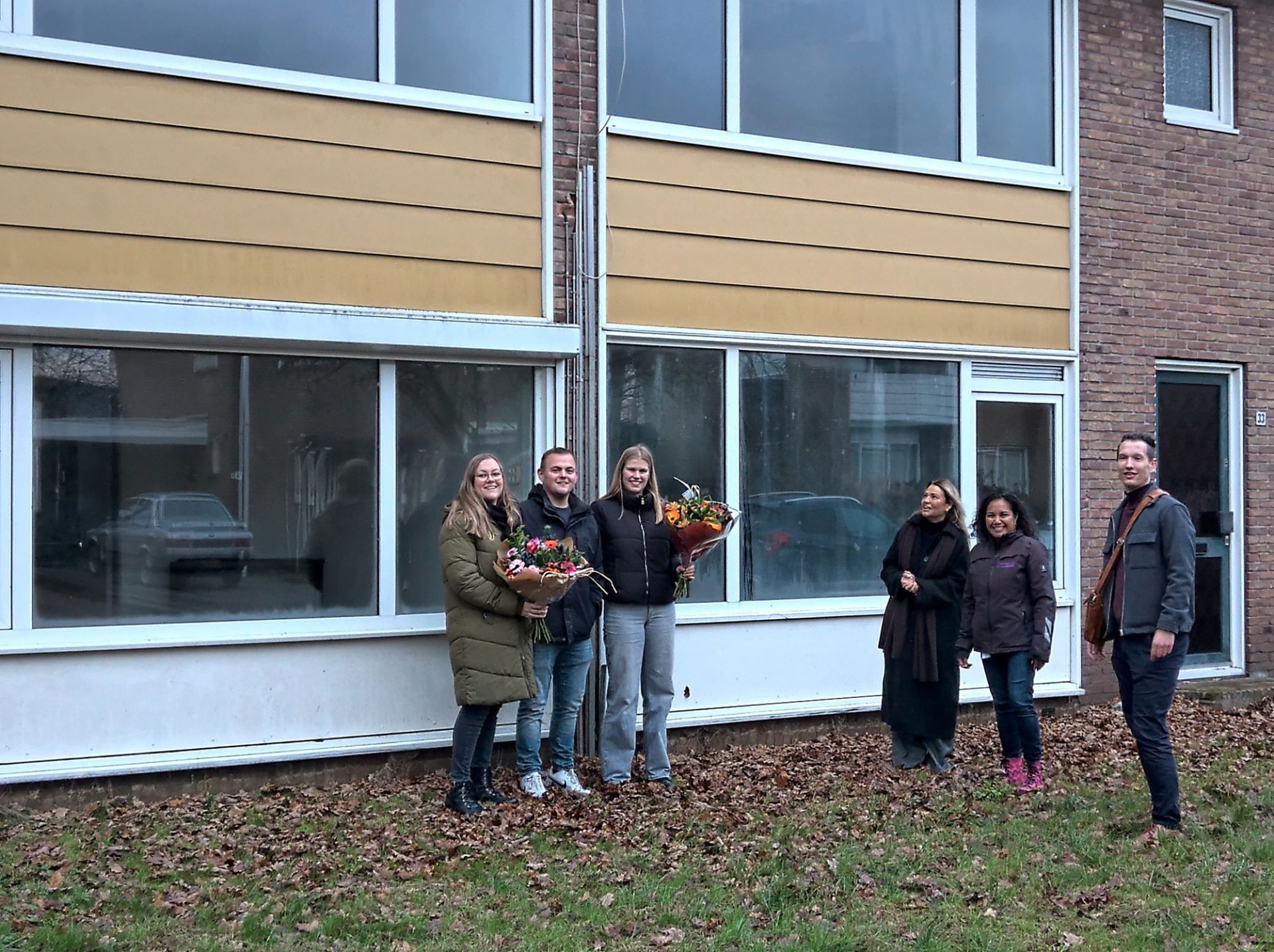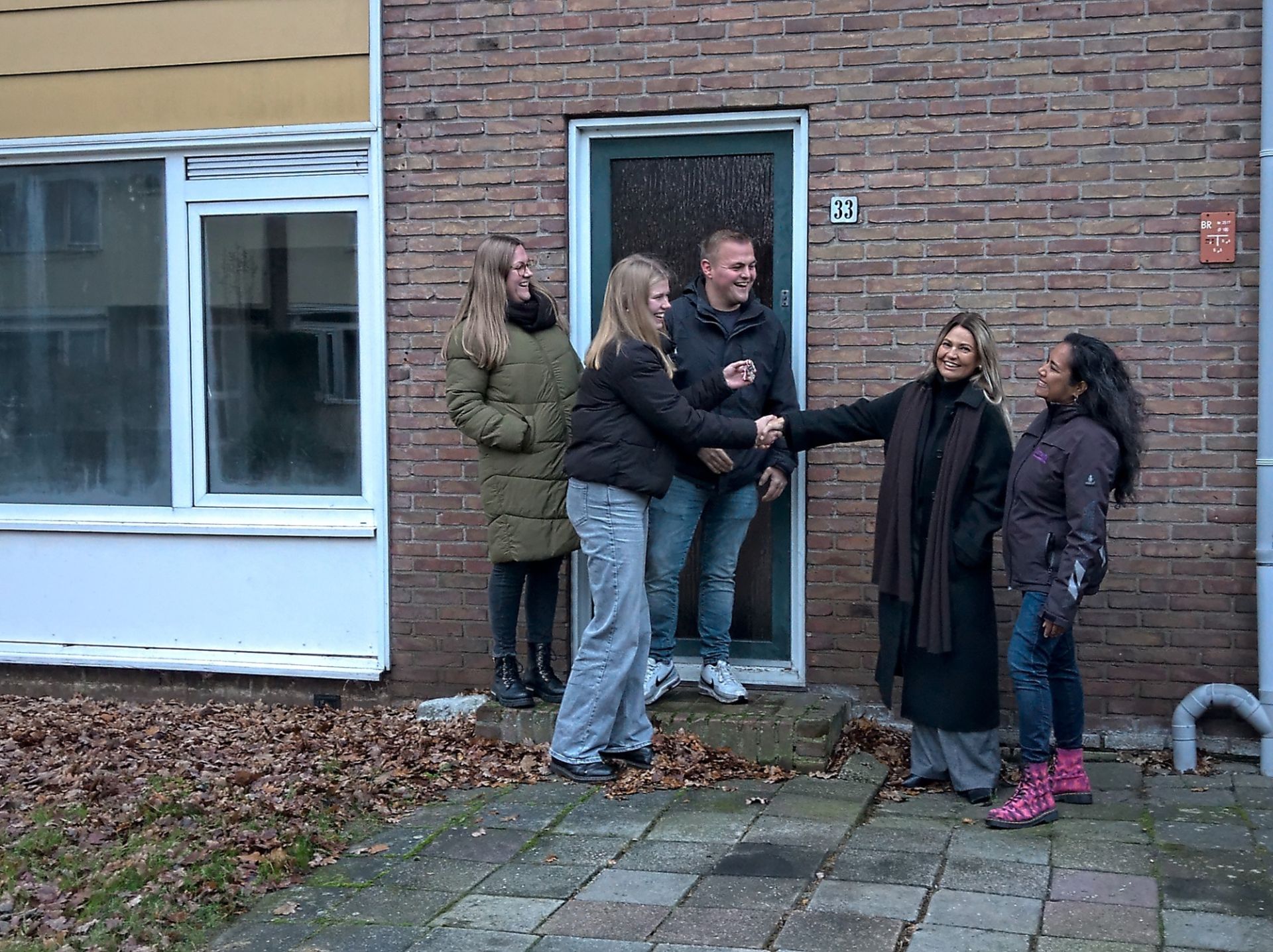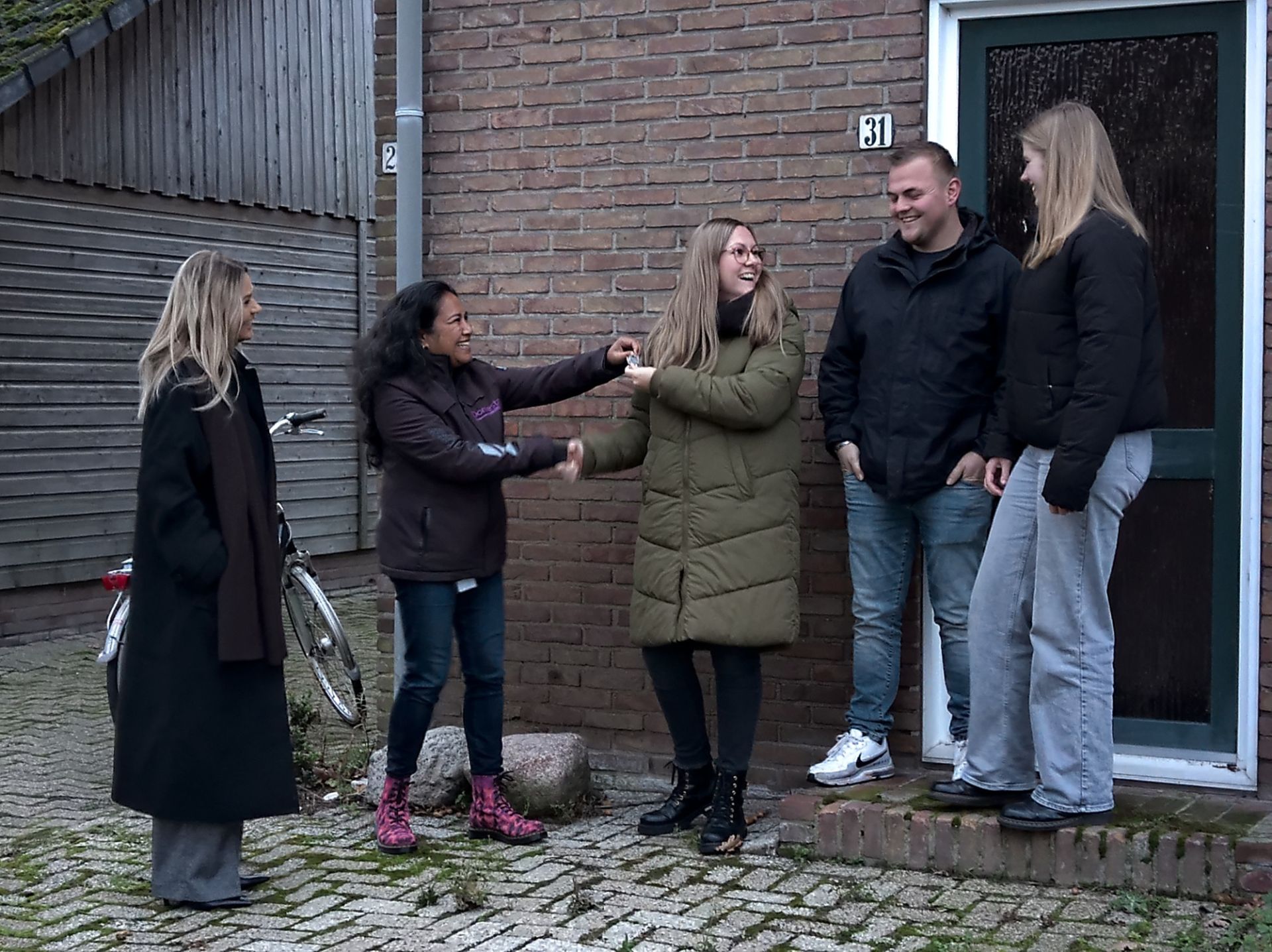 Om 8.00 uur komt Nadine de Van Eklaan in gefietst: “Ik woon nu nog bij mijn ouders hier om de hoek aan de Europaweg, net als Dennis. Dus we zijn lekker dichtbij.” Dennis en Carmen komen eraan en inmiddels is Mike Doldersum van JIP makelaars er ook. Samen met onze Saphira Laturake en Monique Scheper, zorgt hij ervoor dat de sleutels vandaag naar broer en zus gaan.