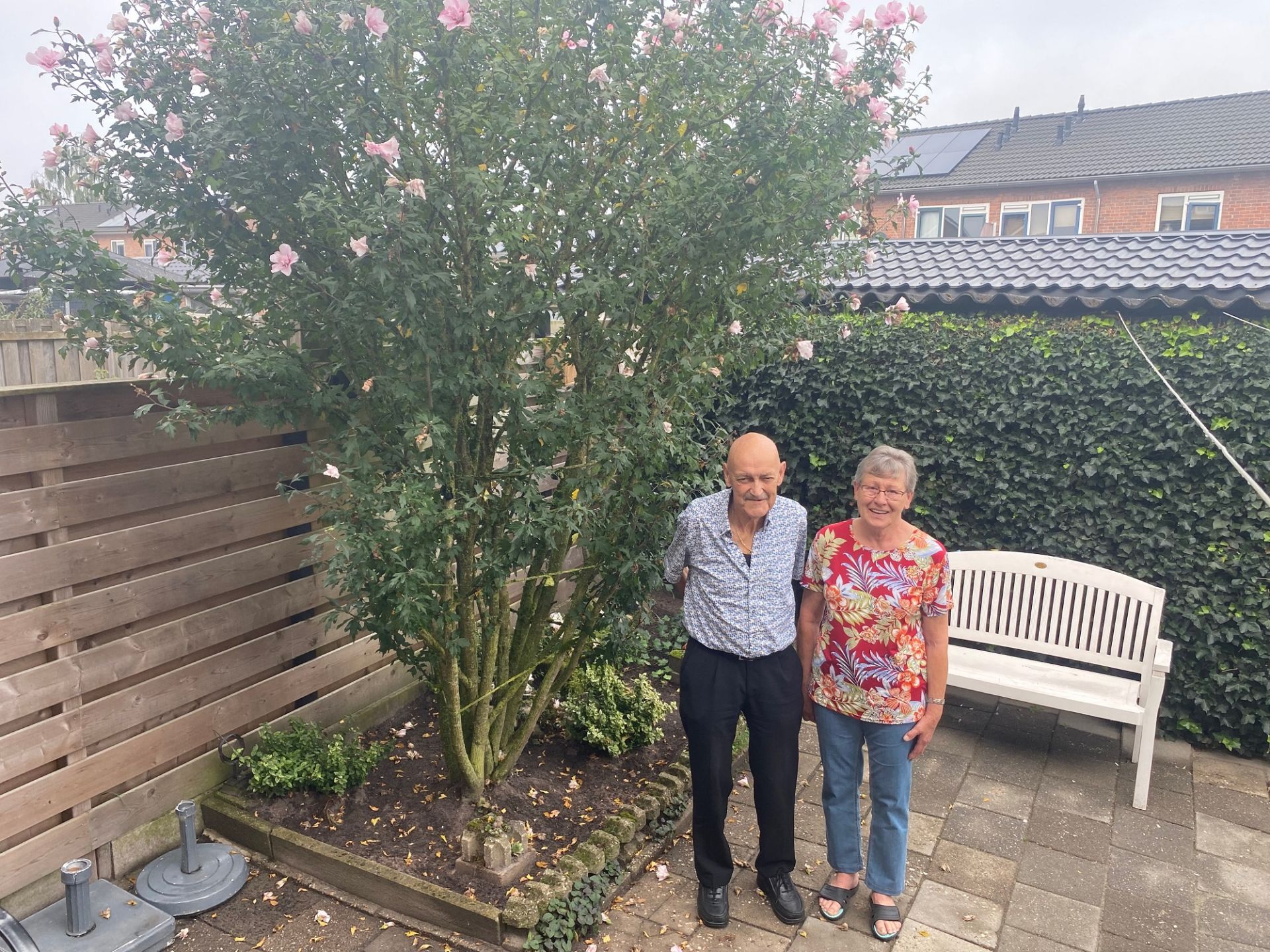 Miny en Henk zijn bezige bijen in hun tuin. Die is best groot. ‘Eigenlijk wordt het ons af en toe teveel. We zijn al bijna 80. Over het algemeen gaat het goed, maar Henks gezondheid laat te wensen over’, zegt Miny.