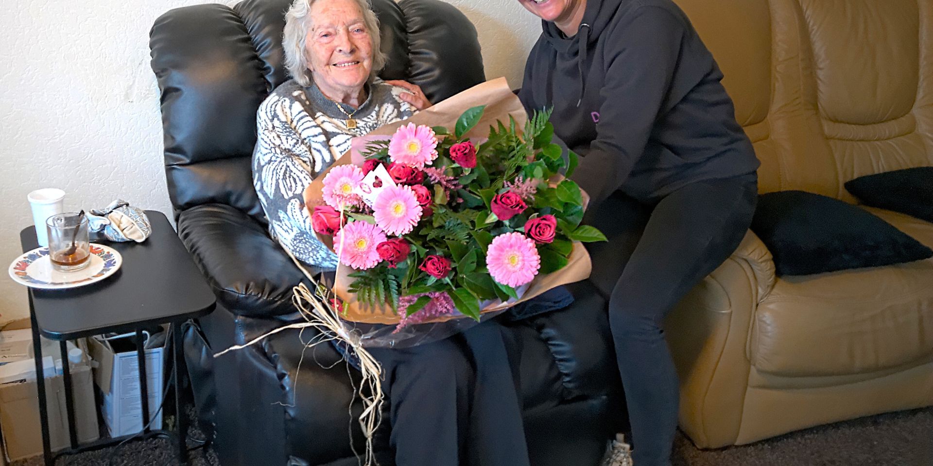 “Vorig jaar werd ze 90 jaar en toen hebben we de club afgehuurd om het te kunnen vieren. Dat werd me toch een feest”, vertelt dochter Roelie. We kijken naar alle foto’s met familieleden, die mevrouw Bakker heeft hangen in haar huiskamer aan de Doctor J.C. Homanstraat in Coevorden. 50 jaar woont ze nu in Tuindorp, reden voor wijkconsulent Saphira en wijkbeheerder Bonnie om een bloemetje langs te brengen.