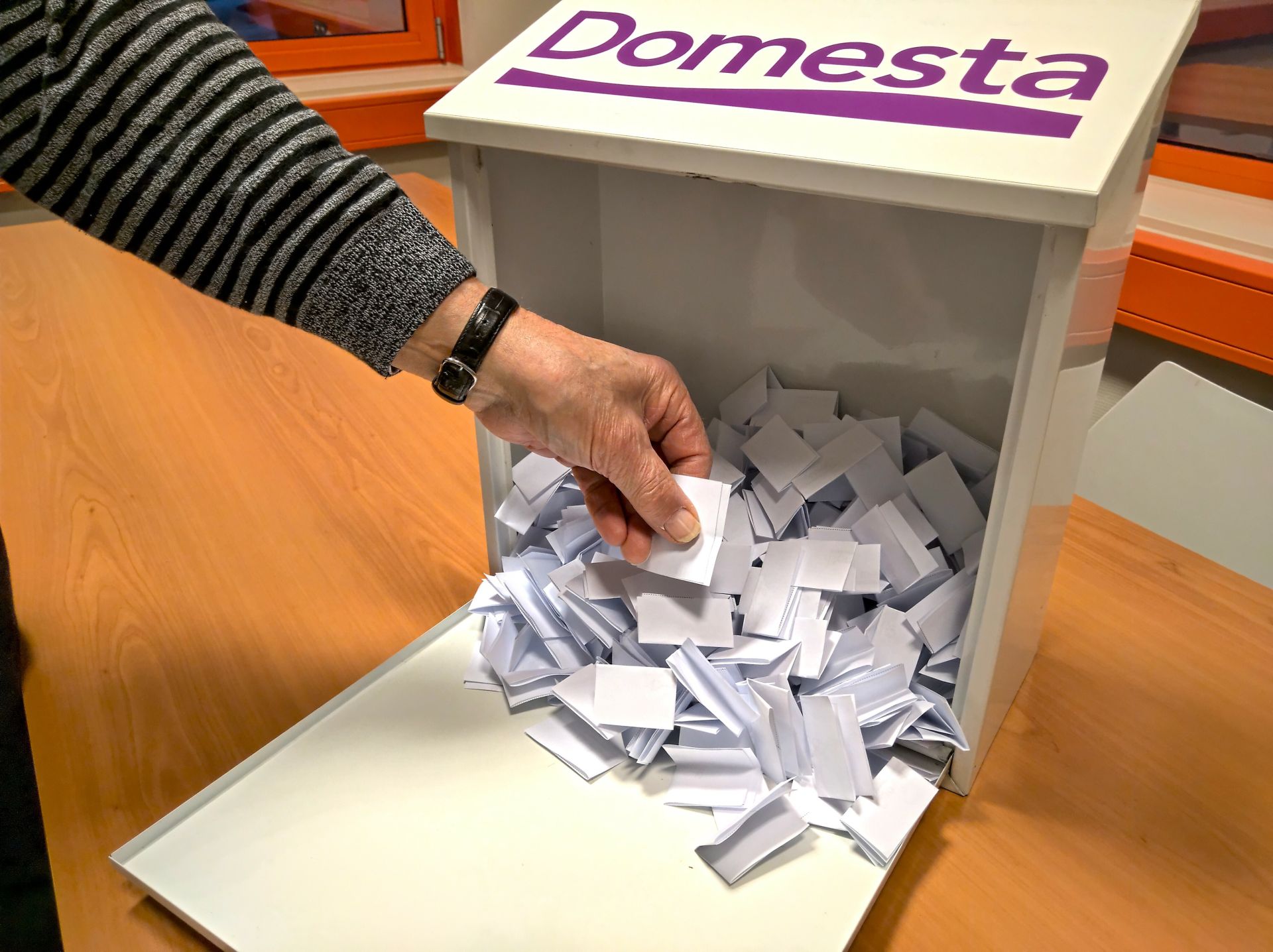 Ook voor onze consulenten Nicolien van der Meulen en Jeannette Hoff is dit een spannend moment. In de Domesta-brievenbus hebben ze alle nummers gestopt die meetellen voor de verloting. Elk nummer staat op de lijst, met daarachter iemand die zich heeft ingeschreven voor de verloting. Nicolien: “Er hebben zich veel mensen aangemeld om mee te doen. Voor de seniorenhuizen zijn 53 aanmeldingen, voor de eensgezinshuizen 346. Van allebei verloten we 2 huizen.” En dat betekent dat er vanavond 4 huizen worden verloot.