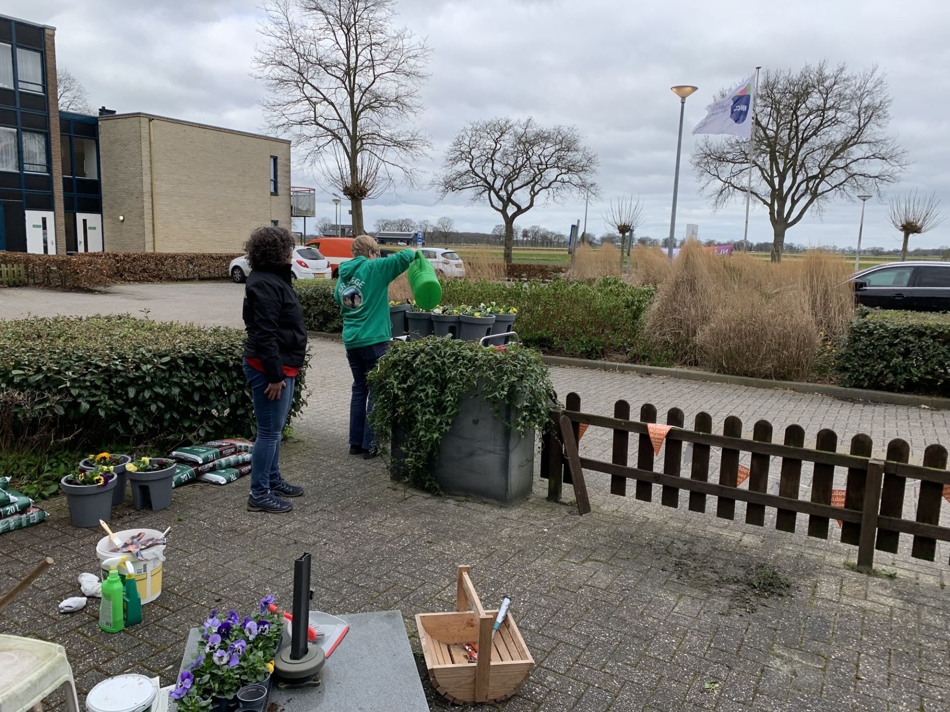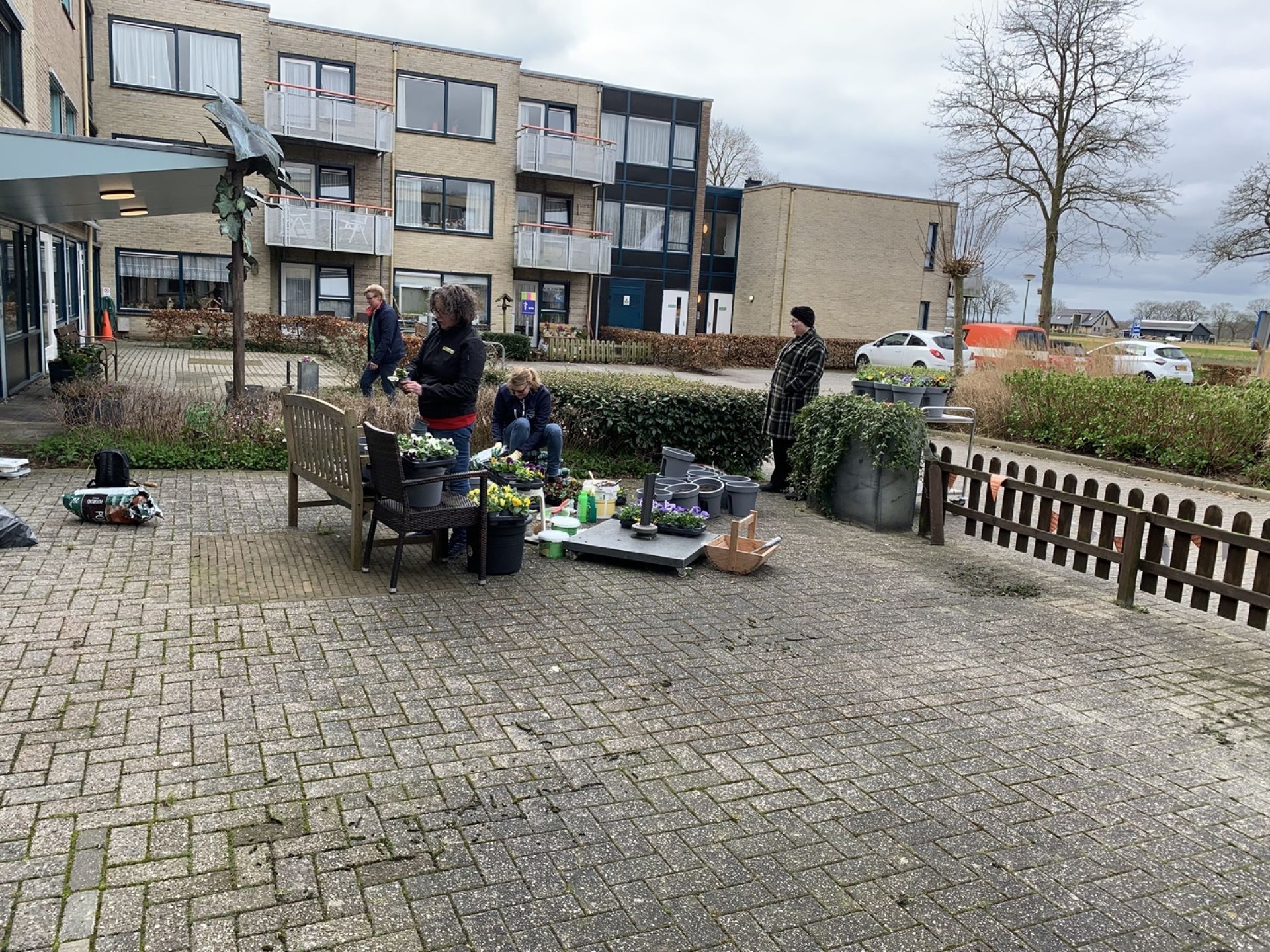 De bloembakken stonden al keurig klaar, net als de zakken potgrond. “Deze vulden we 1-voor-1 met fleurige bloemetjes zoals viooltjes. Uiteindelijk krijgen alle bewoners zo’n mooi gevulde bloembak aan het balkon. Ook komen er bloembakken op het terras” vertelt Gea.