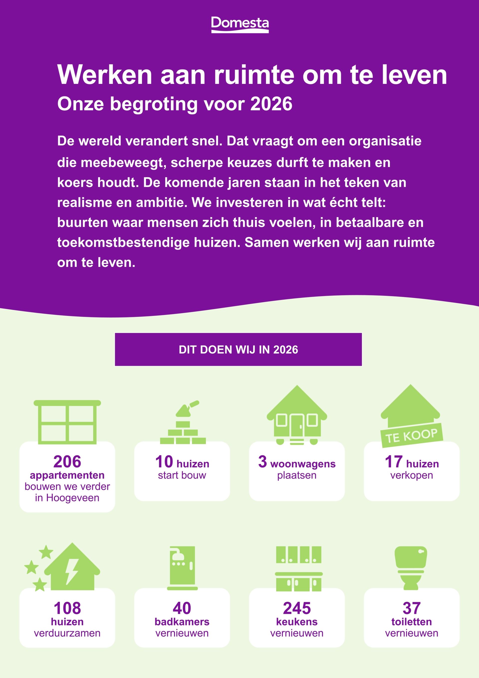 Met onze begroting voor 2026 blijven we investeren in wat voor jou belangrijk is: goede en betaalbare huizen, duurzame oplossingen en buurten waar het prettig wonen is. Zo werken we samen aan ruimte om te leven.