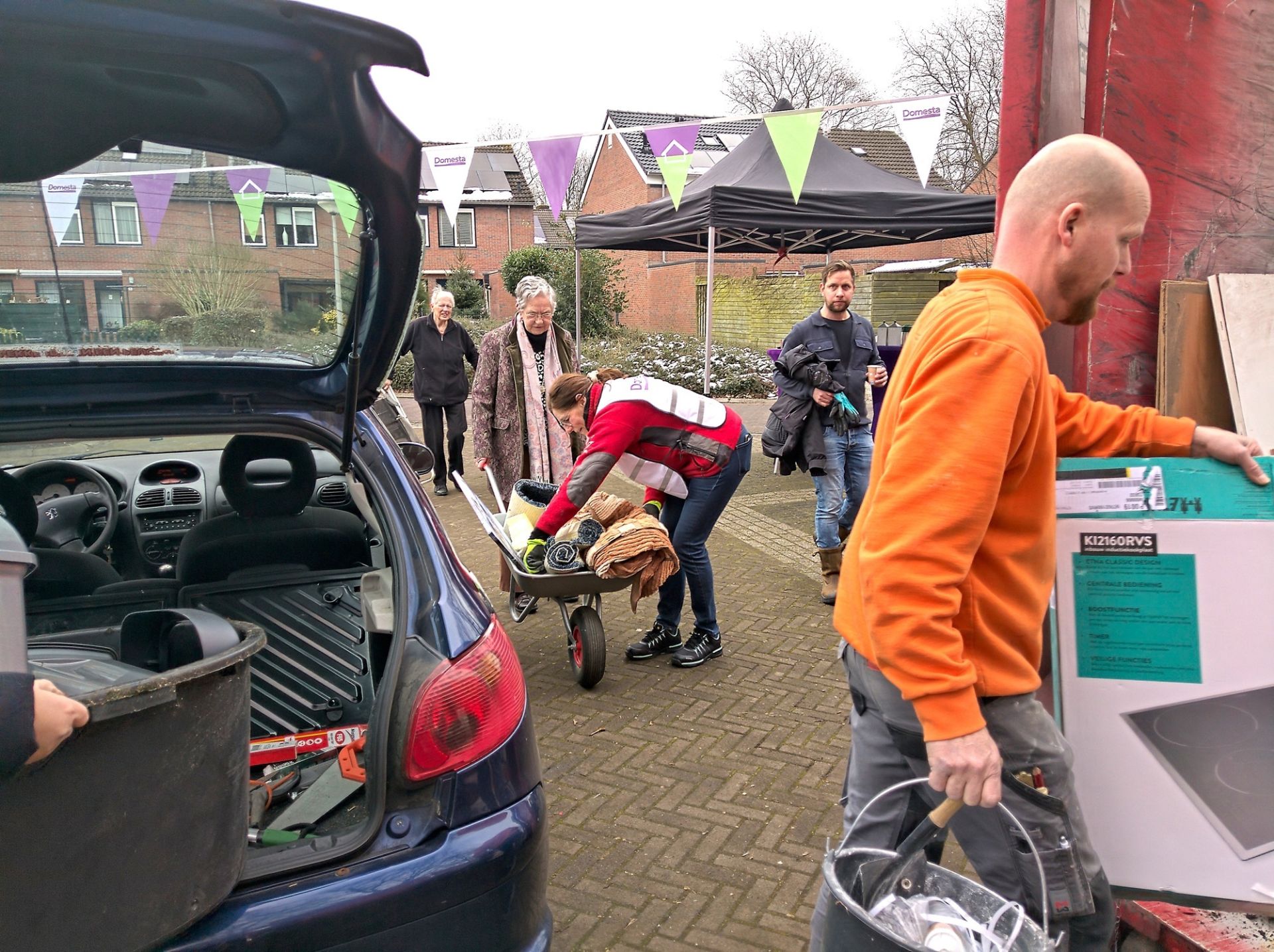 De een brengt een kapotte lamp, de ander heeft de achterbak van de auto vol spullen. Alles mag mee met deze opruimronde. “Tja, ik ben al 2 keer verhuisd en had al veel weggedaan”, vertelt een buurtbewoner: “Wat ik nu nog over heb, kan hier mooi bij.” Een ander heeft wat meer weg te doen: “Ik ben letterlijk mijn verleden aan het opruimen. Dat is fijn, want dan kan ik na de renovatie fris opnieuw beginnen.”