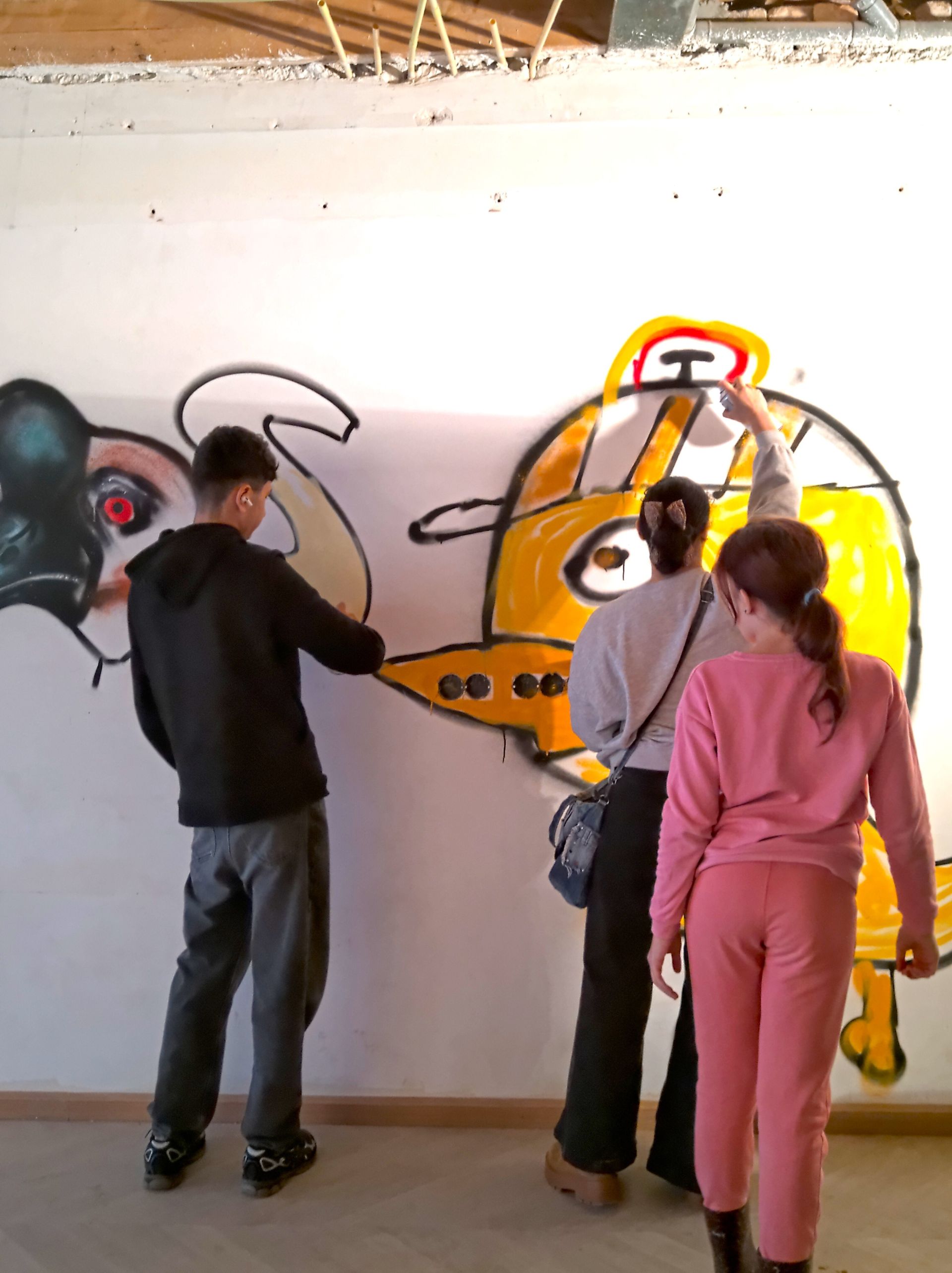 Loyd en Dewi werken graag met jonge mensen. Dewi legt het uit: “Jongeren hebben veel talent. Door kunst met ze te maken helpen we ze bij hun ontwikkeling.” En dat zien ze vandaag ook weer. Loyd hoopt dat er veel mensen komen kijken naar het werk dat de jonge mensen hier doen, vandaag en natuurlijk ook later, als het af is. Want niet alleen de muren worden bewerkt, ’s middags komt de kunst ook op de etalageramen. Zodat iedereen die langsloopt, ervan kan genieten. En de jongeren zelf? Die vonden het echt een mooie dag: “Dit is zo leuk om te doen!”, “Ik heb echt veel geleerd.”, “Het is supergezellig samen.”