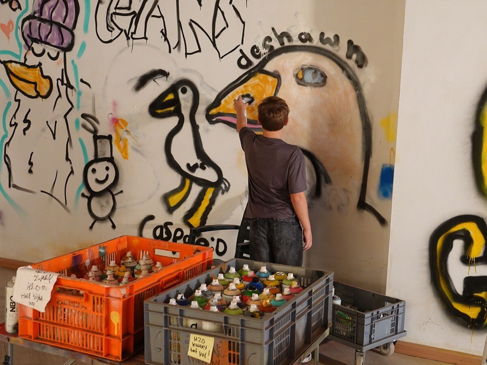 Het is de zaterdag van de Ganzenmarkt. Dewi is al druk bezig met het klaarzetten van spuitbussen en andere spullen. Met 2 jongens probeert Loyd alvast uit wat goede technieken zijn om de verf op de muur te spuiten. Daar komen de eerste jongeren binnen en al snel volgen er meer. Nog even en dan begint de workshop graffitispuiten. Een bijnaam voor Coevorden is Ganzenstad, omdat er vroeger altijd een ganzenmarkt was waar alle ganzen uit de omgeving naartoe werden gebracht door ganzenhoedsters. Dus wat kun je beter op de muur zetten tijdens de Ganzenmarkt dan……ganzen!
