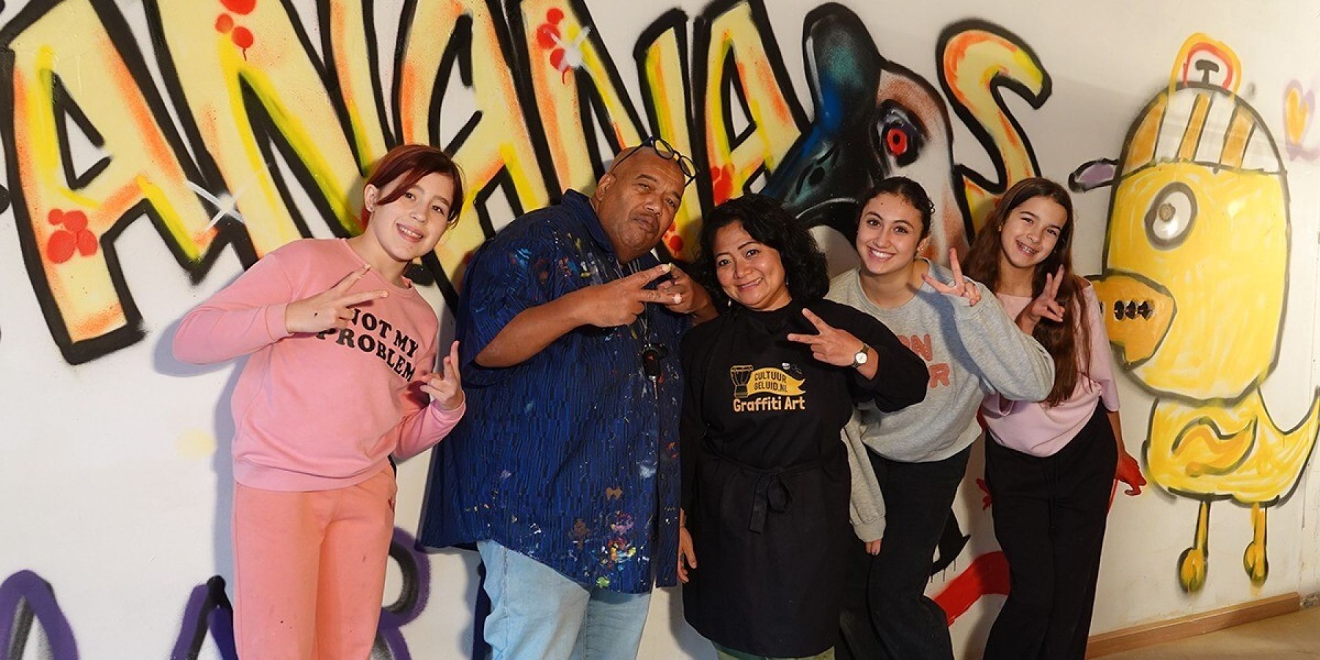 Maar voor het zo ver is, stelt Loyd zich voor op een bijzondere manier: “Ik was de eerste rapper van Nederland”, vertelt hij en dat kun je merken aan de manier waarop hij praat: alsof hij aan het rappen is. Meteen komt iedereen in de stemming. Dewi en hij gaan aan de slag met de jongeren, eerst maar eens oefenen hoe een spuitbus werkt. De een heeft de slag zo te pakken, de ander doet er wat langer over. Uiteindelijk is het zo ver en gaan ze samen bezig met het echte werk: hun idee van een gans op de muur zetten.