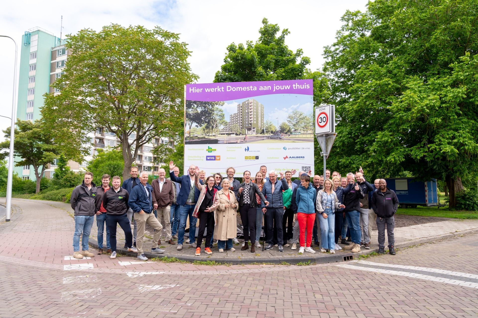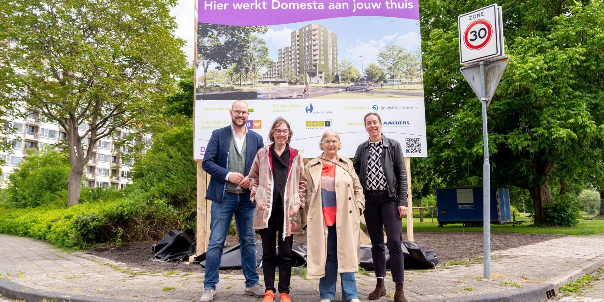 Na de zomer starten we met de bouw van een nieuwe terrassenflat van 11 verdiepingen in Hoogeveen. Deze flat vervangt de huidige flat De Arend, die gesloopt wordt zodra de nieuwbouw klaar is. Vanmiddag gaven Tammy Oosterhagen en Annemarie Roks, bewoners uit de werkgroep Toekomst De Arend, het officiële startsein door het bouwbord te onthullen. Dit deden zij in het bijzijn van wethouder Niek Wind van de gemeente Hoogeveen, Esther Borstlap bestuurder van Domesta en andere genodigden. We verwachten in het voorjaar van 2027 de sleutels te kunnen overhandigen aan de bewoners.